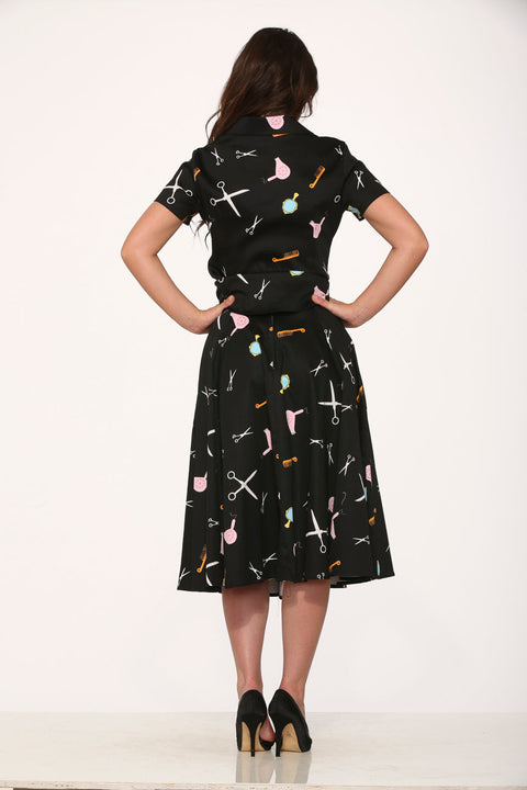 Turn heads in the Orchid Bloom Black Beauty Salon Top& Skirt set, a playful nod to vintage hairstyling chic. This charming ensemble features a short-sleeve button-up top and a matching full skirt adorned with whimsical salon-themed prints—think scissors, blow dryers, and combs in pastel pinks and blues that pop against the rich black background. The cotton-spandex blend ensures a flattering fit with gentle stretch, while the center back zipper and side pockets offer both style and convenience. Perfect for making a statement wherever you go!