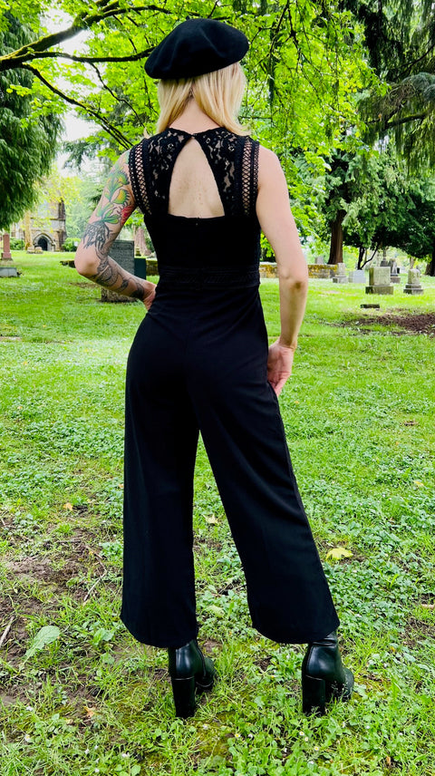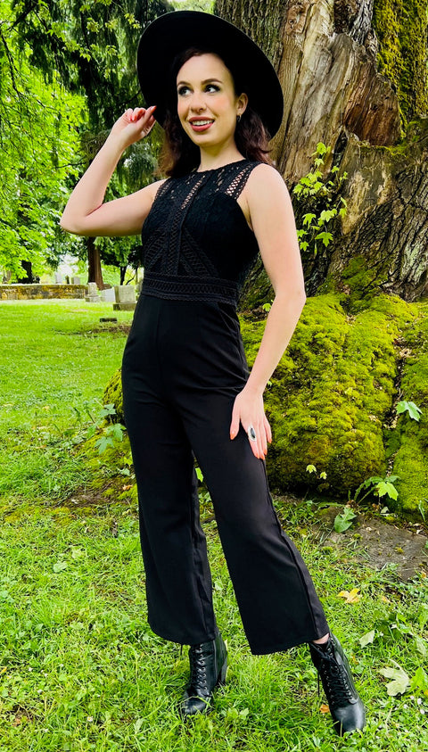 Power, poise, and just a touch of peril — the Branwen Jumpsuit is your darkly chic answer to corporate goth dreams. A tailored twist on our beloved Agatha dress, this jumpsuit features a nipped-in waist, wide-leg silhouette, and—yes—pockets, because witches mean business. The lace-trimmed bodice adds a touch of romantic rebellion, while the cutout back gives just enough intrigue for boardrooms or broom rides. Equal parts structured and spellbinding.