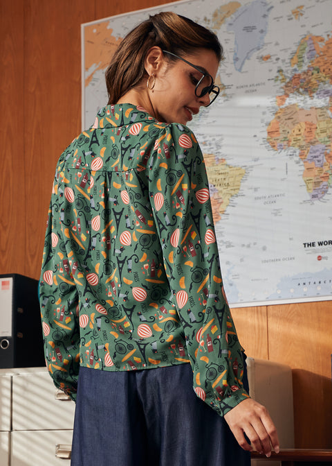 Croissants, wine, striped cats, and the Eiffel Tower dance across a green backdrop, while the relaxed camp collar silhouette keeps things effortlessly cool. With long sleeves, button front, and just the right touch of retro charm, this shirt is your passport to playful everyday adventures—no boarding pass required.