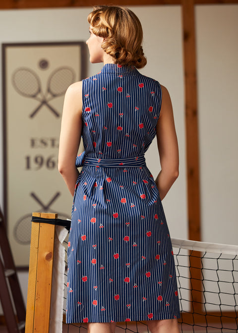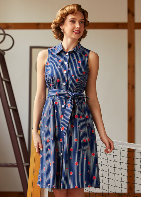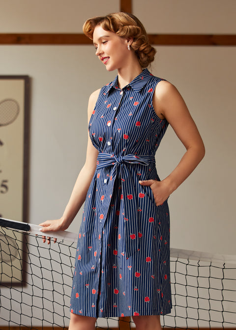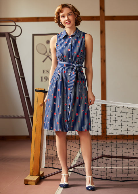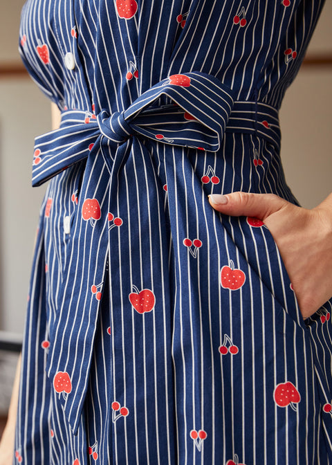 The Can’t Slow My Roll Shirt Dressfrom our ModCloth namesake label brings retro confidence with every step, mixing crisp navy pinstripes with a scatter of juicy fruit motifs that feel straight out of a soda shop daydream.