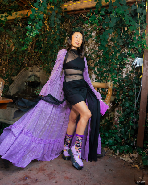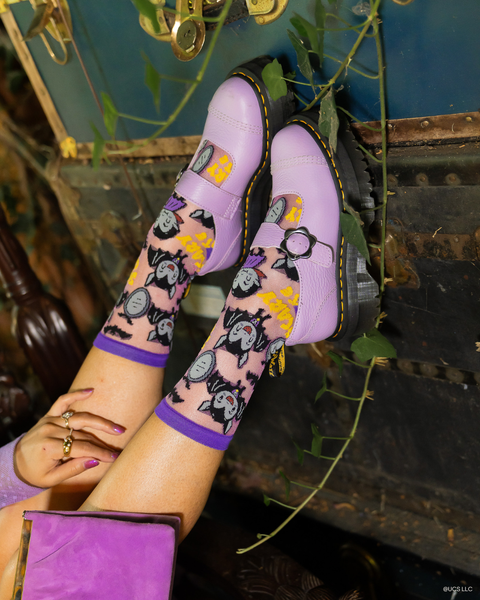 Sink your fangs into spooky season style with the Dracula Scary Cute shimmer sock – a fang-tastic collab between Sock Candy and the legendary Dracula. These socks are bursting with Halloween fun, combining vintage monster vibes with a modern kawaii twist. Set against a shimmer-infused purple-pink background, this sock features an adorable Dracula in bat and vampire form, tombstones, fluttering black bats, and a playful “SCARY CUTE” slogan in bold yellow. Accents of royal purple at the cuff, heel, and toe give this fright-night look a polished finish.