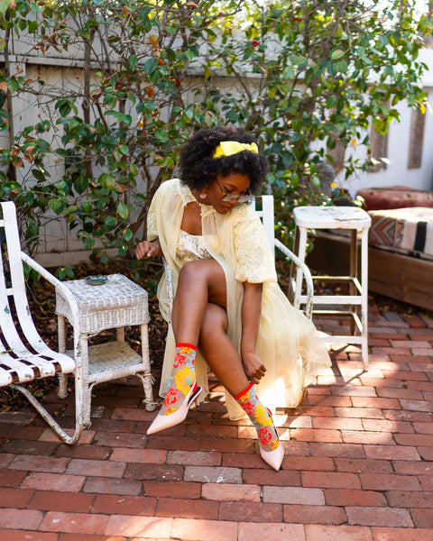 Not for the faint of heart, our Flower Power sheer sock is bold and bright. Vivid orange-red, sunny yellow, and striking aquamarine flowers burst against a sheer backdrop, creating the perfect harmony of funky and elegant. A soft pink accent adds an unexpected twist, making this sock a true conversation starter.