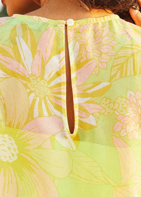 With a crew neckline and a keyhole with button-loop closure at the back, flowy elbow-length flutter sleeves, a removable lime green camisole underneath for optional, added coverage, and a boxy cut, this effortlessly retro-chic shirt is ready for some summer style action.
