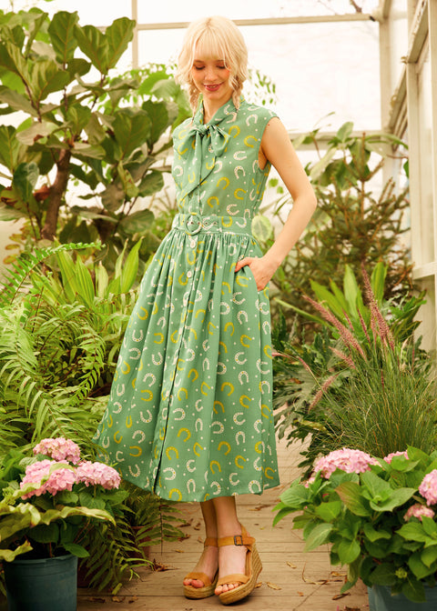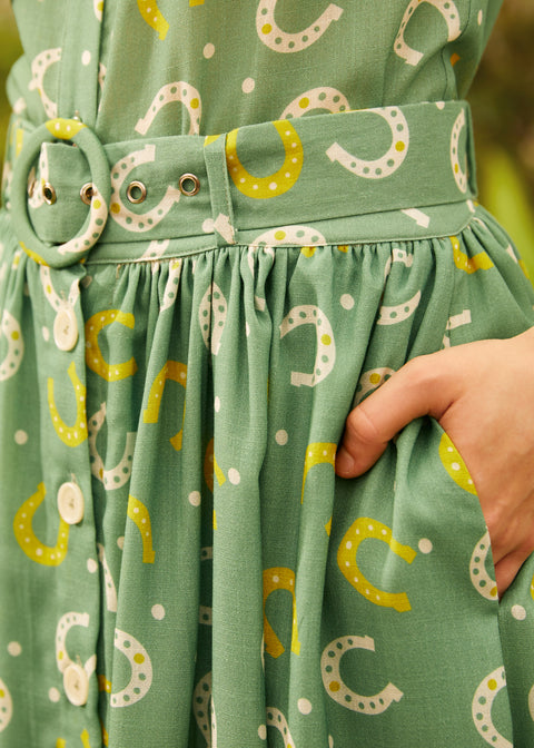 Glide through the golden hours of spring in our Meadow Step Skirt from the ModCloth namesake label. This delightful green horseshoe-print skirt is made from a comfortable woven fabric and features functional pockets and easy button access. The pullover style ensures a seamless fit, making it perfect for picnics in the park or leisurely weekend strolls.