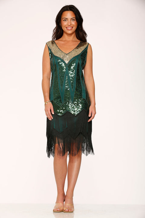 Light up the dance floor in this radiant emerald green flapper dress by Orchid Bloom. Featuring shimmering sequins, a gold-accented neckline, and layered fringe for playful movement, this vintage-inspired piece brings Gatsby glam to any celebration.