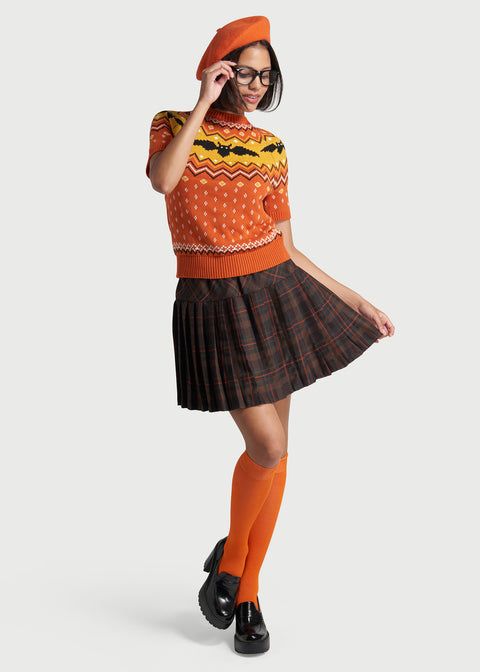 Quirky and ‘bat’ to the bone, this orange short sleeve sweater from our ModCloth namesake label will make any outfit boo-tiful with its exclusive Fair Isle pattern at the yoke featuring flapping black bat motifs that are framed by criss-crosses, stripes, dots, and zig-zags, along with polka-dots scattered all over. Made from a super soft cotton knit, this pullover sweater is a classic crew neck cut in an easy fit that is ideal for cool-weather layering year-round.