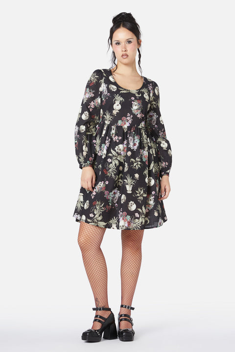 Leap into a realm where the whimsical and the gothic playfully intertwine with the Printed Dress from Dangerfield. This unique piece showcases the captivating ‘Memento Mori’ artwork – a gentle nudge to cherish every moment, enveloping you in a narrative as old as time whilst you stride with a modern flair. Fashioned in a classic fit and flare cut, it cinches at the waist and cascades down to dance around your legs, offering a silhouette that’s both flattering and frolicsome. The long, puffy sleeves add an extra dash of drama, perfect for gesturing expressively in spirited conversations or simply wrapping yourself in a cozy embrace. Its round neckline frames your visage, serving as a versatile canvas for your favorite accessories. Crafted from cotton in an ever-elegant black, this dress is a testament to the joy found in the macabre. Whether you’re attending a candle-lit dinner or exploring a local art gallery, this dress promises to be a delightful companion.