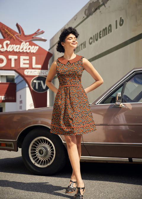 Fun and totally functional, this retro dress is bound to be your new favorite! Shown in our Mushroom print, this 60s style cotton dress features a contrast Peter Pan collar, contrast piping throughout, a-line skirt with side pockets, and a back zippered closure.