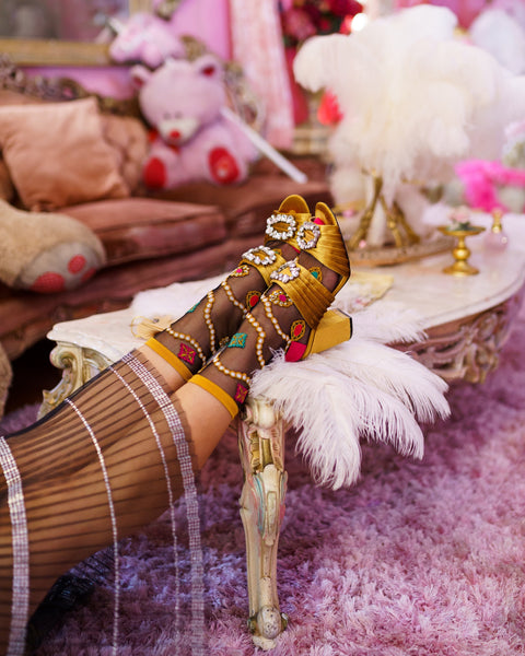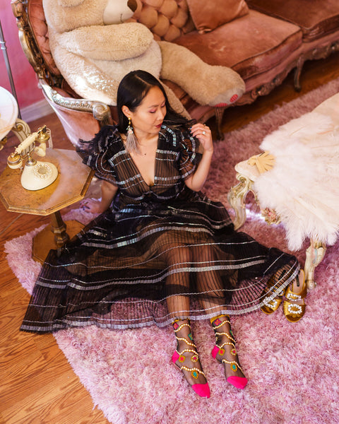 Adorn your feet with luxe pearls and vintage jewels for fancy nights out. Set against a black sheer fabric, this is your go-to luxury ankle black sock for pairing with dressy heels for an unforgettable look.
