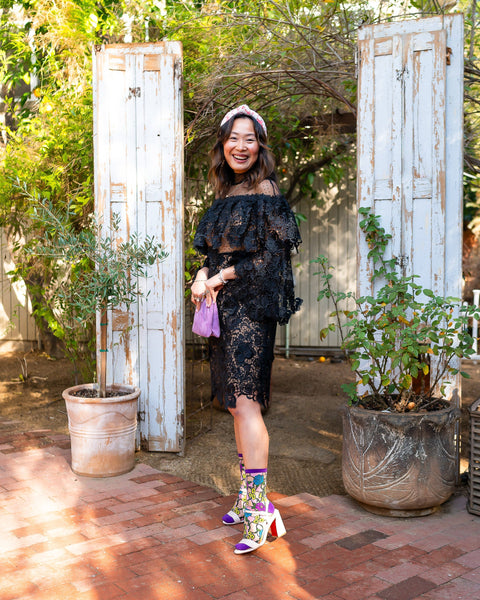 Inspired by Beauty and the Beast, our Stain Glass floral sheer sock features purple, yellow and blue florals along with abstract pink pieces that create the illusion of stain glass. Finished with a purple heel, toe and cuff for the perfect touch of elegance and femininity.