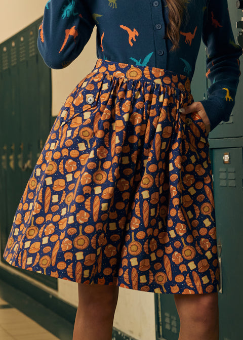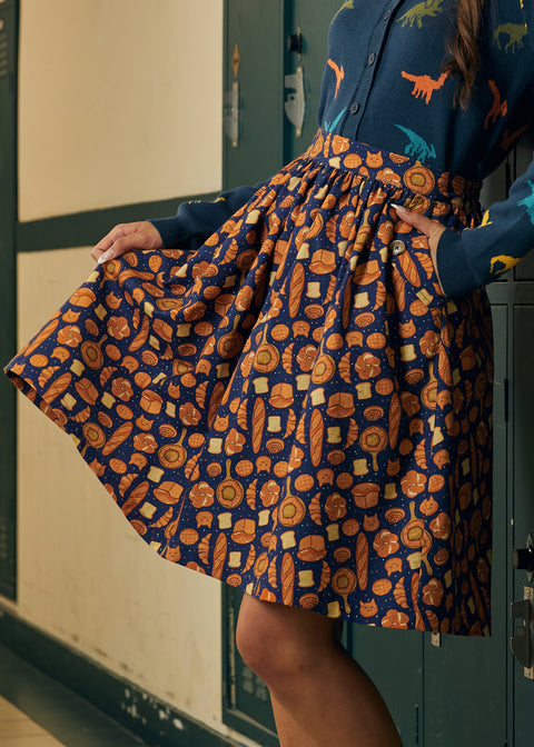 Bring charm to your everyday with The Pocketful of Fun Skirtfrom our ModCloth namesake label. Shown here in the Purrfectly Bakedprint of breads and playful kitties, this cotton cutie features buttoned side pockets to keep your treasures (or snacks) secure, plus a comfy elastic back waist for easy wear. With its knee-length swish and versatile styling, it’s made for cozy café stops, bookstore strolls, and every “loafing around” moment in between.