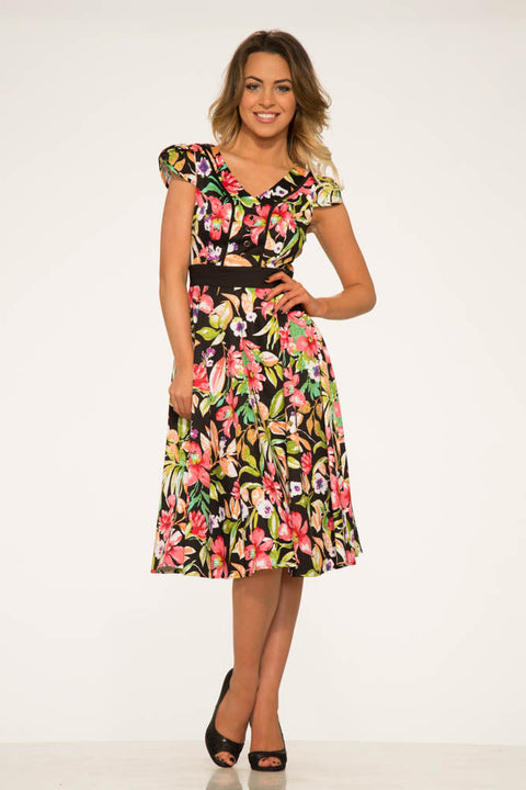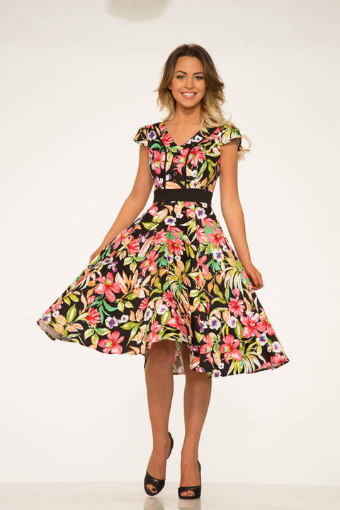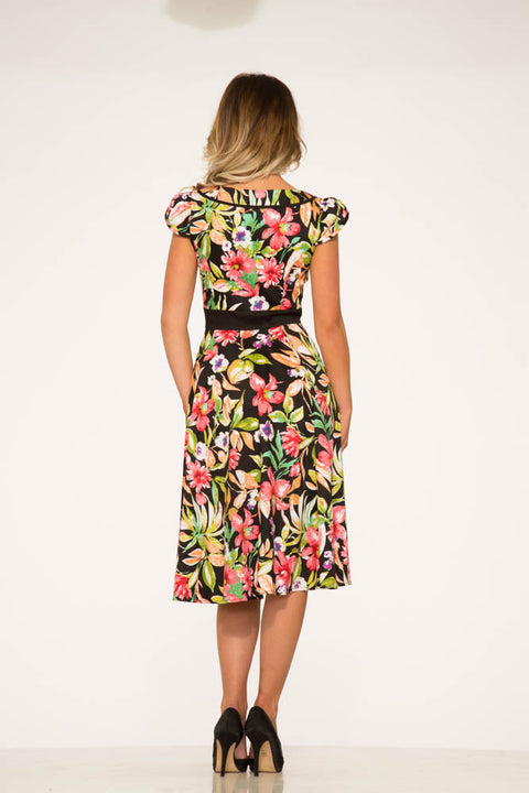 Bring a tropical paradise to your wardrobe with the Orchid Bloom Tropical Mix Floral Swing Dress. Featuring a lively floral print in vivid shades of red, green, yellow, and white against a sleek black backdrop, this dress radiates summery vibes and effortless elegance. The figure-flattering silhouette is enhanced by a fitted bodice with cap sleeves and a contrasting waistband that cinches at the waist, flowing into a classic swing skirt. Crafted from a soft cotton-spandex blend for comfort and ease, and finished with a side zipper for easy wear.