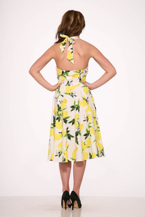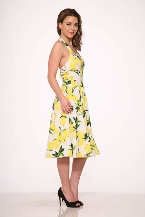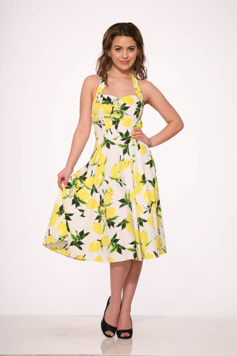 When life gives you lemons—wear them! The Orchid Bloom White Lemon Halter Swing Dress is a zesty, vintage-inspired stunner featuring a fresh lemon print on a crisp white backdrop. With its flattering halter neckline and full swing skirt, this dress brings a burst of sunshine to every twirl. The cotton-spandex blend ensures a sweet and comfortable fit, perfect for picnics, parties, or just brightening your day.