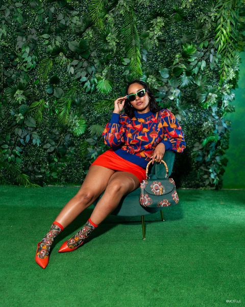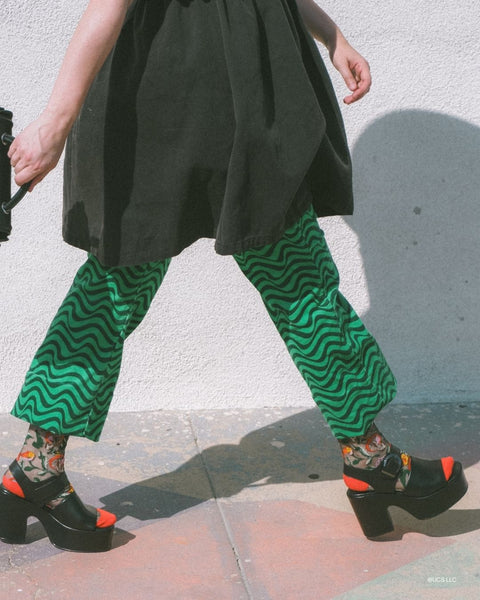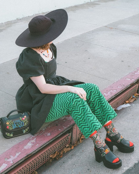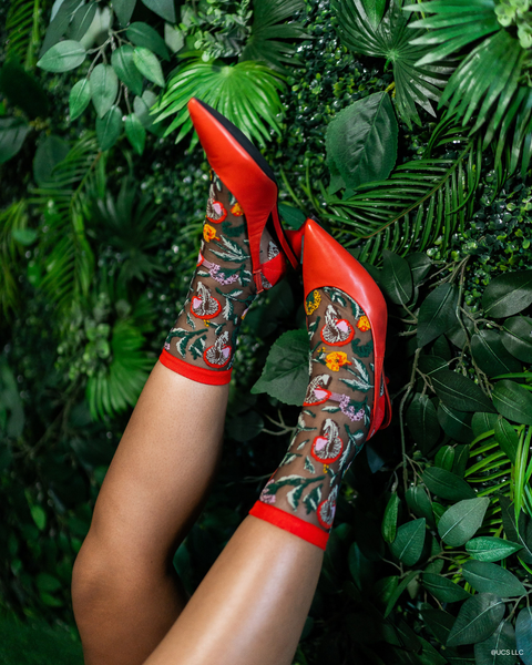 Step into the world of Elphaba with the Elphaba Land Mushroom Black Sheer Sock, featuring wild mushrooms and poppies in vibrant shades of red, orange, and yellow. This design represents the Ozian forest where Elphaba resides, and is set against black sheer fabric for an edgy look. Finished with a poppy red cuff, toe, and heel for an unexpected pop of color.