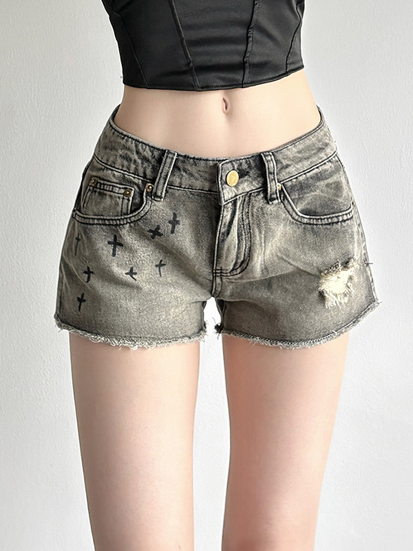 Jeansshorts im Distressed-Kreuz-Print im amerikanischen Stil
